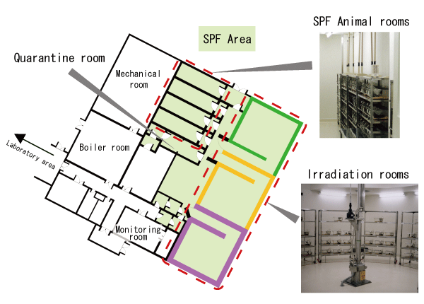 SPF Area comprising of the SPF animal rooms, the irradiation rooms and so forth is maintained at 23}2 with 50}10% humidity, +6mm Aq atmospheric pressure, and a light/dark cycle of 12 hours.