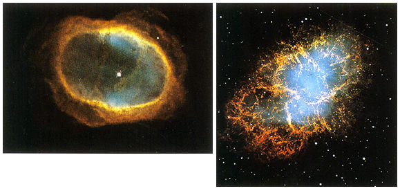 皆さんは、アメリカのハッブル宇宙望遠鏡が撮ったきれいな惑星状星雲の写 真(図1)を見たことがあるでしょうか? 惑星状星雲とは、望遠鏡でのぞくと一見惑星のように見える銀河系の中の丸いガス星雲のことです。代表的な例としては、6500光年の距離にある「おうし座」の「かに星雲(M1またはNGC1952)」が有名です(図2)。この星雲は946年前の1054年に「超新星爆発」を起こした星の残骸で、爆発してからしばらくは、晴れた日なら昼間でも見えたそうです。ちなみにその記録が、鎌倉時代の代表的な歌人の一人である藤原定家(ふじわらのさだいえ)が残した「明月記」に「客星」の名で残っています。
