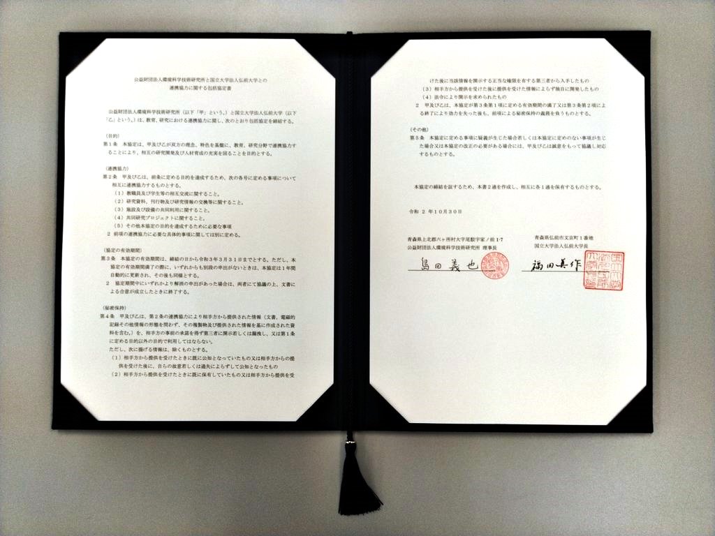 弘前大学との教育、研究における連携協力に関する協定書について、郵送により相互に署名され、令和2年10月30日付をもって締結されました。