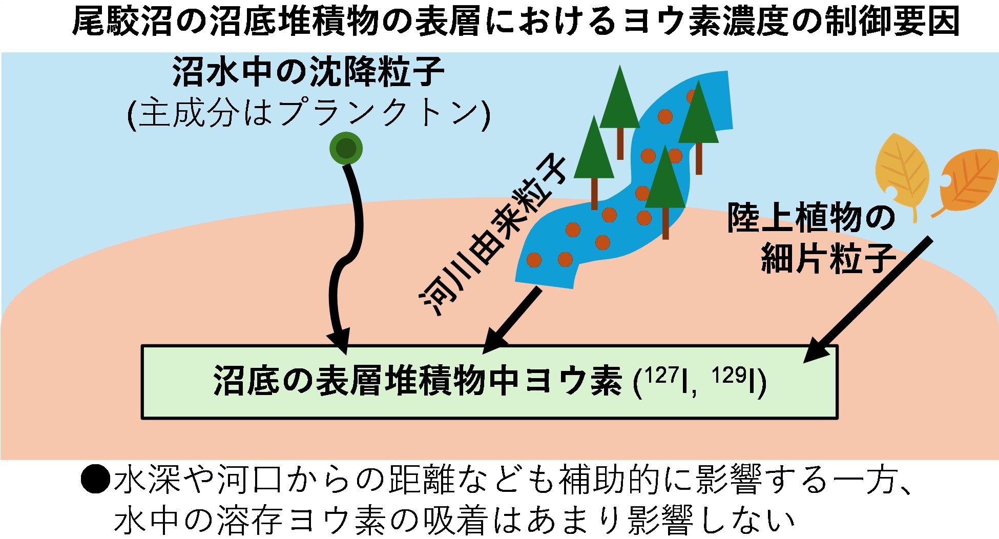 一般的に水流の穏やかな海底の堆積物においては、@粒子の供給、A堆積物中の有機物への水中溶存ヨウ素の吸着、の2つの主要経路でヨウ素濃度がコントロールされています。一方で、本研究の対象領域のように流動性の高い水域での検証は十分になされていませんでした。本研究では、対象領域で、河川粒子、植物プランクトン粒子、表層堆積物粒子、沼水中の沈降粒子、及び沼中の水を採取し、ヨウ素や各種元素等を分析して、それらのデータの特徴から尾駮沼の沼底表層堆積物における安定及び放射性ヨウ素の各濃度が、どのような要因で決定するかを解析しました。その結果、これらのヨウ素濃度は、ヨウ素を保持している各種粒子の収支で主にコントロールされ、水中に溶存しているヨウ素の新たな吸着の影響は小さいことが明らかとなりました(下図)。また、これらに加えて、水深や河口からの距離といった地形学的要因も、補助的に堆積物中のヨウ素濃度をコントロールすることが示唆されました。本研究の成果は、再処理施設から排出される放射性ヨウ素の環境動態の把握にとって重要な知見となります。