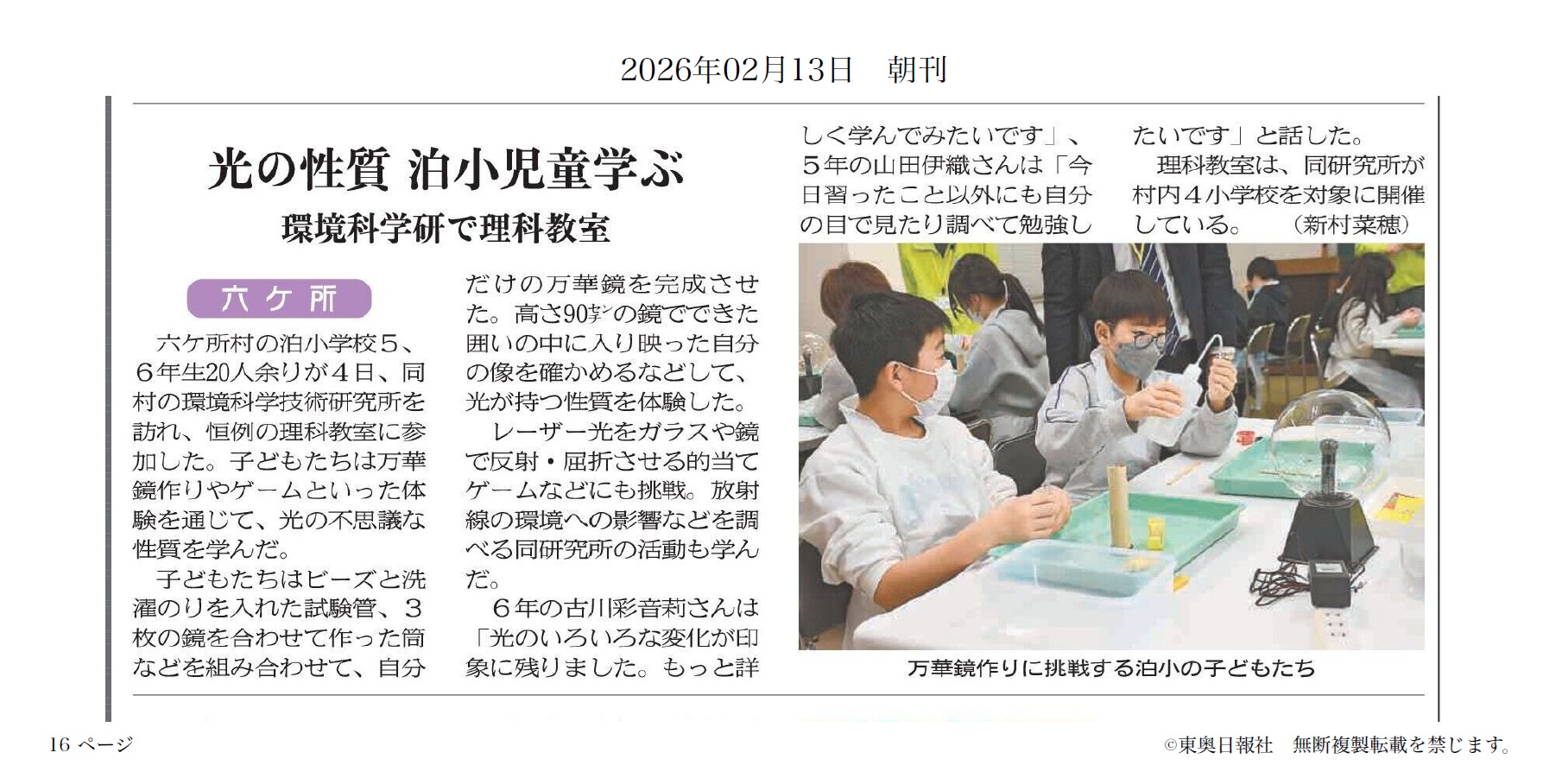 なお、2月4日実施の泊小学校の理科教室では東奥日報社の取材があり、2月13日にその内容が掲載されました。