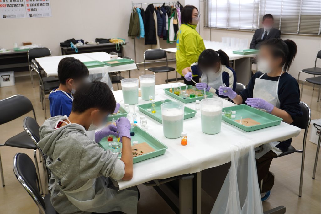 また、「ものが固まる」というテーマでの実験では、レプリカハンドづくりと人工イクラづくりを行いました。レプリカハンドづくりでは、手の型をとるという熱を発しない固まる現象と、出来た型に石膏を流しいれ石膏が熱を発しながら固まるという2種類の固まる現象を体験しました。人工イクラづくりでは、食紅を混ぜてカラフルなイクラを作ったり、作ったイクラをつぶしてみたり、勢いよくスポイトから液を出し細長い形のものを作ったりと、それぞれが工夫を凝らし、楽しく取り組んでいました。