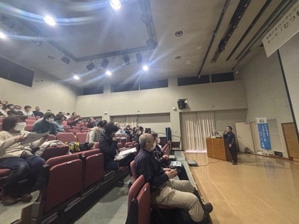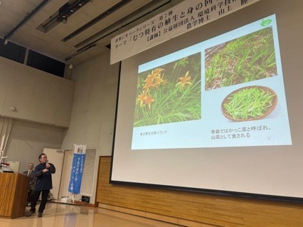 音楽会では、むつ市出身の小鳥孝之氏(ギター)と橋あさか氏(フルート)が、海や大地がテーマの曲を演奏しました。そのあと、当所共創センターの山上睦が、『むつ特有の植生と身の回りの植物』と題し、野生植物の生存戦略などについて講演しました。ミズバショウ、ザゼンソウ、タンポポの生存戦略、恐山の酸性の環境に適応したヤマタヌキラン、イソツツジ、チャツボミゴケなどの植物特性、ヒバ林の根圏微生物生態などを紹介し、会場からたくさんのご質問をいただきました。