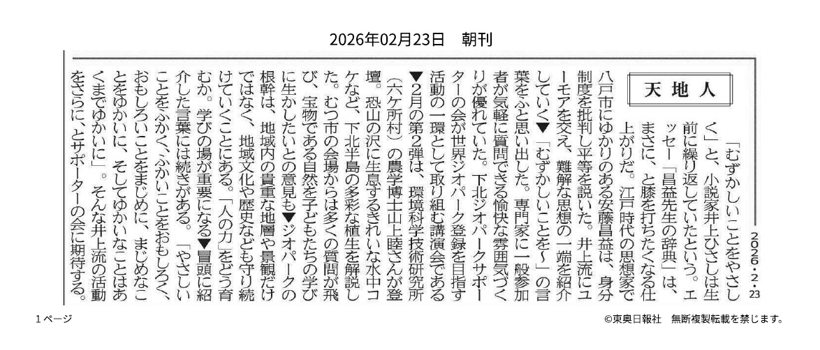 | 東奥日報2026年2月23日付の朝刊コラム「天地人」 (この画像は当該ページに限って東奥日報社が利用を許諾したものです) |