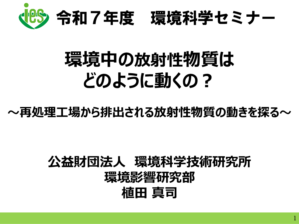 令和7年度に行われた環境科学セミナーの環境科学技術研究所からの報告「環境中の放射性物質はどのように動くの?〜再処理工場から排出される放射性物質の動きを探る〜」について、当所の環境影響研究部長 植田真司からの報告の動画を公開いたしました。なお、発表資料につきましては、排出放射性物質影響調査ホームページ(下記参照)に掲載してありますので、それも合わせてご覧ください。