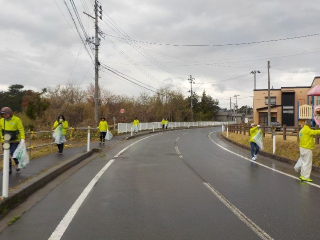 当日は小雨が降る中、トングとごみ袋を手に、尾駮レイクタウン内の決められたコースを巡回しながらごみを拾い、地域の環境美化活動を行いました。